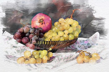 « La corbeille de porcelaine contient des pêches et du raisin blanc… »